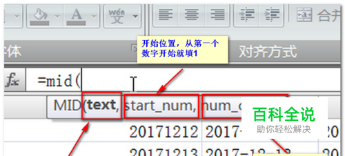公式的用法,大家看一下图片里面的说明吧,我已经把它分开来说明了。用mid公式我们可以从文本字串符里分别返回年月日三个字符串,如例子中的2017,12,12.