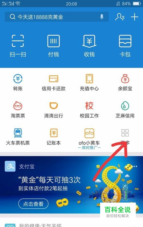 首先,打开我们的支付宝,到达支付宝首页,这里有很多选项,我们点击更多,点击更多后就出来了很多服务,比如外卖呀,打车呀什么的。