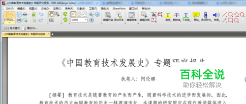 打开待处理的pdf文档。打开电脑之后,找到需要处理的pdf文档的位置,双击打开这个pdf文档。如图,小编打开了一个《中国教育技术发展史》专题研究报告。(该报告文件已在中国知网公开,本文借用举例,单纯分享学习。)
