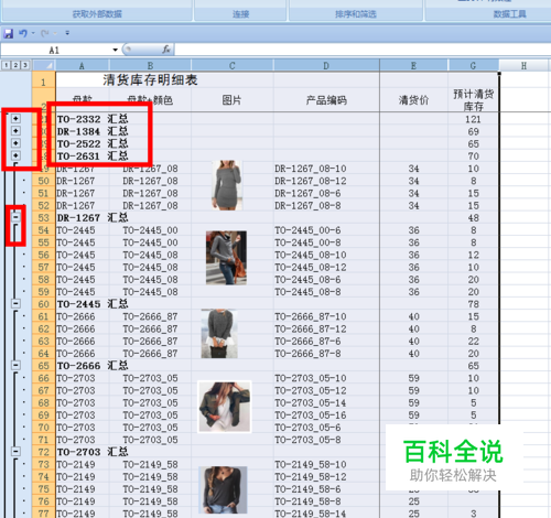 点击确定后就出现在了以下的如图,大家可以看到表格的左边有“+”和“-”汇总预计清货库存那列也自动求和了。