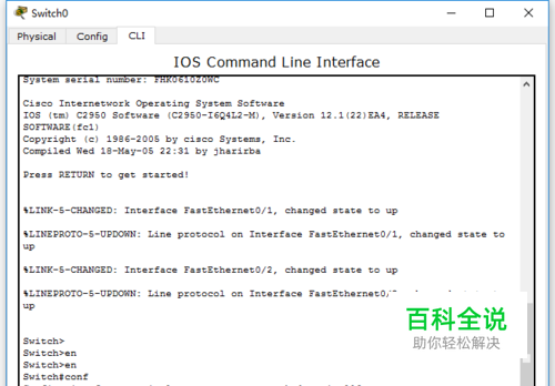 点击交换机 输入enable 回车 conf 回车 回车 进去全局配置模式