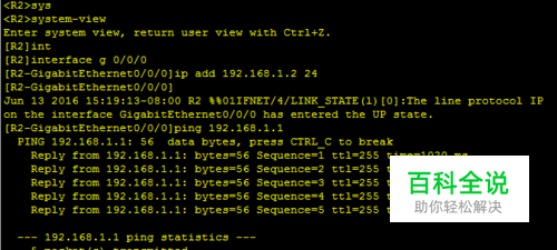 修改R1、R2基本信息,并在接口模式下分别添加ip地址,并ping测试通信