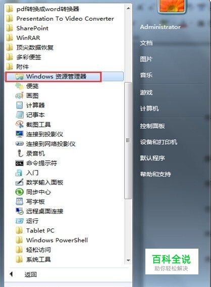 进入开始菜单,请依次点击 “所有程序——附件——Windows资源管理器”。