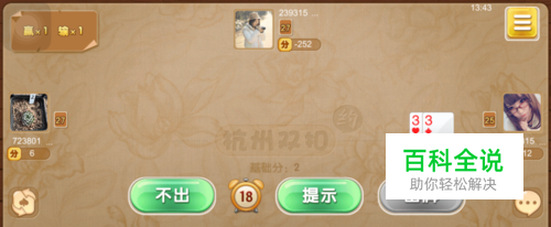 2、出牌 规则:首家出牌可以出规定内的任何牌型。轮到玩家跟牌时,玩家可以选择“不出”或出比上一个玩家大的牌。当有三家都“不出”的时候,则另外一家获得新一轮的出牌权,可以出任意牌型。二二组成一对,相互不让对方逃牌。 顺序:逆时针 出牌顺序:第一局或者双扣随机一家先出牌;平扣或者单扣由头游先出牌。 接风:当某玩家出完手上的牌后,如果其他玩家都放弃。则下一轮的任意出牌权是他的同伴。