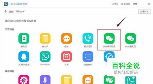 进入到数据恢复的主界面。我们可以看到许多苹果手机数据均支持恢复微信聊天记录、短信、备忘录、通讯录、照片...我们点击“微信聊天记录”图标即可。