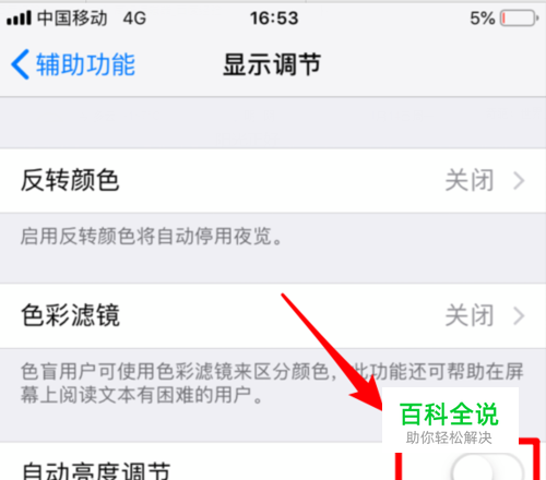 我们点击该选项后方的开关,将其关闭。关闭后,苹果手机就不会自动调节屏幕亮度。