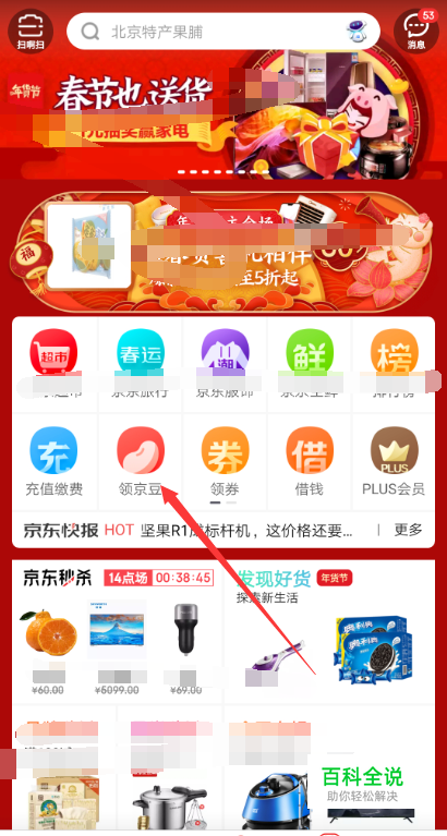 打开京东APP并登录,然后直接点击京东首界面里的【领京豆】,如下图所示。
