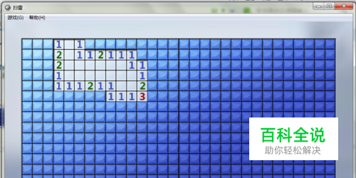 电脑任意左击蓝色格子,显示如图,数字代表的是周围所存在的雷的数目,判断哪些格子是雷区,右击可以进行标记(红旗)。手机需要先点击翻开,插旗时要先点击插旗,其他与电脑版类似。 当然此处有些个人的总结:排成一行的格中,两个1夹一个2,1最近的格子必是雷区。排成一行的格中,两个1夹两个2,2最近的格子必是雷区。其他容易判断在此不再多言。