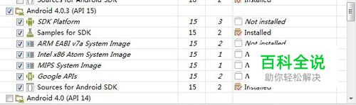 可自动更新来,他讲的版本是 4.0.4版本的,目前更新到 4.2.2 。 打开 SDK Manager.exe ,会打开一个 SDK管理器,先更新最新版本,全打钩,很快的,更新完会自动加载新版本的,然后找到自己想使用的版本,看后方是否 打对号,英文 Installed, 如没有,选择后 右下角 上方按钮 Install 6 packages , 意思是安装6个包,下方的是删除,看图。