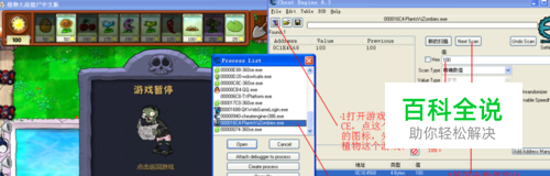 重启游戏。重新加载,这一步很重要。很多忘了这一步还以为是找出来的全错了。刚才扫出来的指针里,选文件扫描器,选重新扫内存。选数值。输入100.为什么输入100,因为这里的阳光就是100. 其实,这种方法多用几次,你扫出来的基址,也基本能判断出来,就是正确的。地址尽量选短一点的。偏移次数少一点的。还有一点很重要,一定要选EXE+XXXXXX的地址。实际操作中,像有的DLL+XXXXX什么的基址,有时没产生出来,不稳定。双击他,就直接生成了一个基址加偏移的地址了。可重开游戏验证一下,是不是基址是正确的呀。