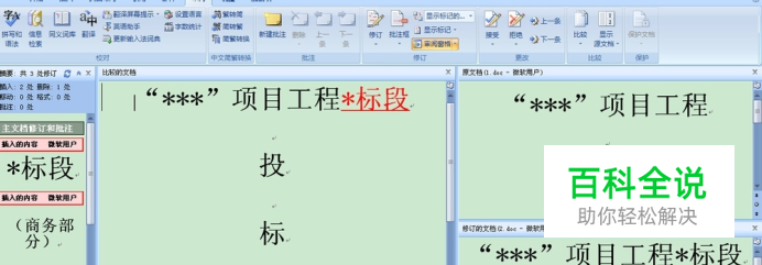 中间窗口显示的是修订格式的文本,左边窗口显示所做的修改摘要,右边上面窗口是原文档,下面窗口是被修改过的文档。怎么样,一目了然了吧!