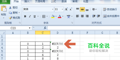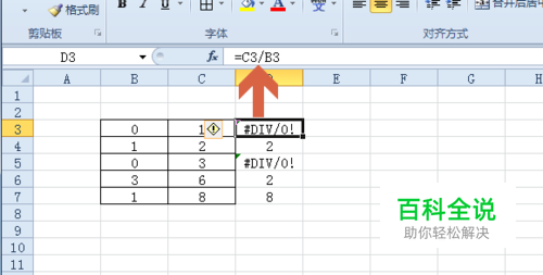 如果想不显示这些计算错误符号,可先点击计算错误的单元格,查看该单元格的计算公式。如本例中是“=C3/B3”。