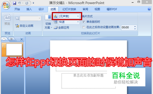 6、更改合适的速度。 选择了合适的声音之后,更改一下ppt页面切换的速度即可,如下图。
