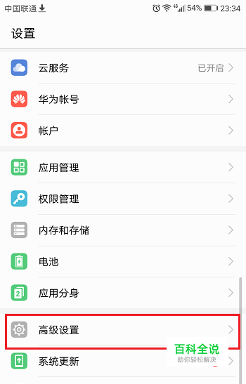 第二步进去手机设置界面之后,下拉找到高级设置,如下图所示:
