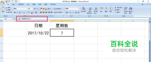 如图,要想计算B2单元格的日期对应的星期数,可利用公式=WEEKDAY(B2,2),然后点回车得出结果7,即星期天。