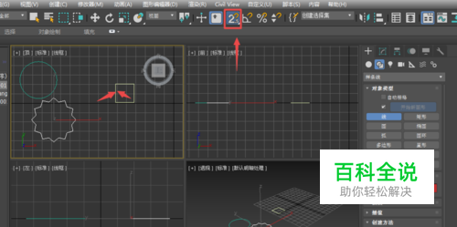 首先打开3dmax,然后在创建平面图形中,在顶视图创建一个半径为500mm的圆,绘制一个星形,设置半径1为500、半径2为600,设置边数为12.再创建一个矩形,设置长宽分别为500mm。