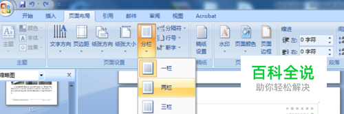 然后在菜单栏点击“页面布局”,在其下方找到“分栏”,在其下拉菜单中,选择栏数(本例选择两栏);
