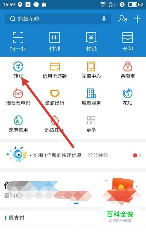 打开支付宝首页,点击“转账”进入,如下图所示:
