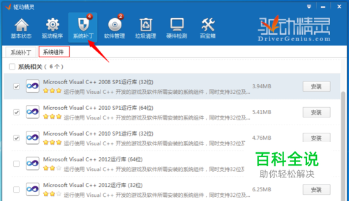 在驱动精灵主界面“系统补丁”的“系统组件”一栏下,把推荐您安装的“Microsoft Visual C++运行库”全部安装(如下图)。