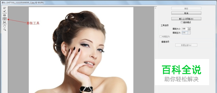 可以选择最下面的放大镜工具 进行细节调整 画笔20左右大小,(鼻子等用同样的方法,如需缩小鼻子则选择膨胀工具上边的褶皱工具缩小)