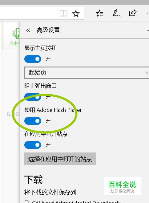 在高级设置下,我们默认允许的网站播放flash插件是关闭的,这个时候我们需要把它打开,点下开关按钮就可以打开了。