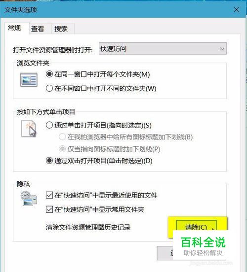 在打开的窗口中找到隐私中的“清除文件资源管理器历史记录”旁边的“清除”按钮即可。