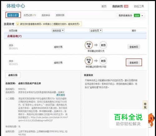 请找到“我的淘宝—卖家中心—体检中心”(如图所示),接下来找到急需处理的淘宝虚假交易扣分,点开查看原因就会有详情展示出来了,再点击“提交申诉”,便可以进行申诉咯! 注意:如果没有“我要申诉”而是“申诉过期“,表示已过申诉期无法再进行申诉咯!