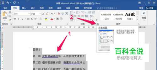 接下来小编开始介绍自己的小技巧,首先选中所有的目录,然后按照下图中红色箭头步骤2点击【段落设置】,如下图: