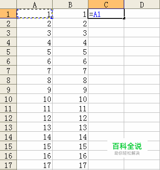 在C1处打出“=”号 (注意是括号内的=号),然后点击A1。