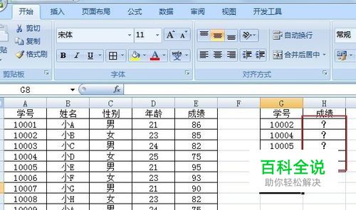 总表如图,需要从第一组数中得到第二组数据中指定的一部分学号的成绩。首先确保第一组中学号列在成绩列的前面。因为学号列是2组数共有的关键字段。