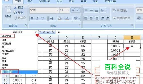 在成绩列第一个单元格中调出Vlookup函数。调出方法如图。