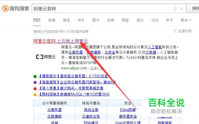在搜索栏中搜索“阿里云官网”,点击链接并进入,如图所示。