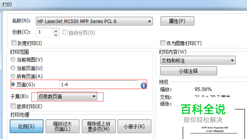 大量双面打印前建议先选4页或者8页做测试。下面以4页作为例子。 1.选择打印范围、子集--仅奇数页面 点击确认打印,打印完成后如果纸张卷曲,建议用东西压一段时间,纸张恢复再翻面翻入打印机。
