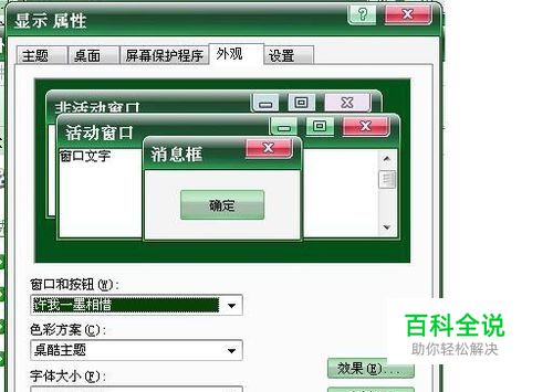 在网页搜索中,输入“电脑主题”,在搜索结果中,下载一款电脑主题。 在网页搜索中,输入“电脑字体”,在搜索结果中,下载一款电脑字体。 在控制面板-外观和显示,在右下角,“”字体“,选择一款字体,点左上角的“完毕”。 在右下角点“显示”,“外观”-“窗口和按钮”中选择下载的桌面主题,软后设置字体大小。 在“效果”,中选择“”大图标“, 保存设置就可以了。