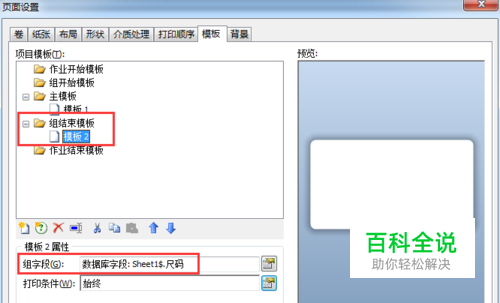 然后,为了实现空白标签的效果,打开“页面设置”对话框,在“模板”选项卡中,新建一个“组结束模板”,然后在下面的模板属性中,组字段也链接上一样的数据库字段。