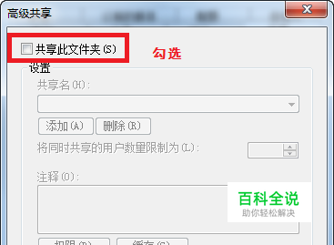 在共享设置页面点击高级共享按钮,进入设置页面。在高级共享设置页面勾选“共享此文件夹”,然后点击确认按钮