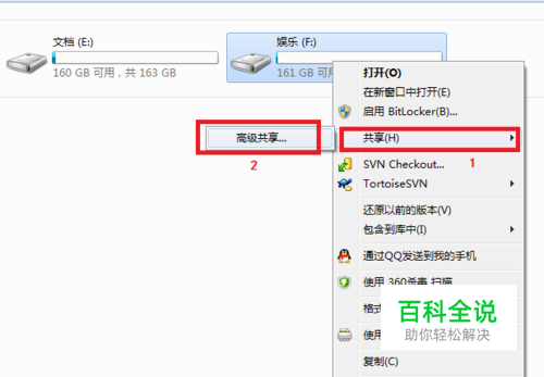 选中你要共享的文件夹(这里是F盘),右击点击共享——高级共享,打开共享设置页面。