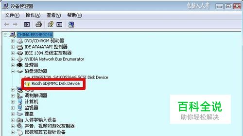 原来SD卡插在电脑上的SD卡槽上,操作系统是不能正常识别SD卡的。后来换了SD卡槽驱动程序就能识别了,但随之而来的问题是,设备管理器中,磁盘驱动器底下有一个 Ricoh SD/MMC Disk Device设备上有黄色的警示号。