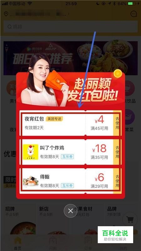 进入app以后你可以领取到一些优惠券,这些优惠券是可以在购买食物的时候,是可以节约你的购买成本的。