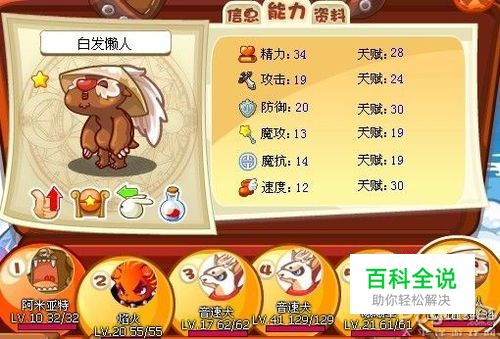 NO,2 白发懒人 多个王牌技能,超厚的血量,目前算的上神兽级别的宠物,但是前期相当难练。反击(37级学),就是把敌方给予的物理伤害翻倍还回去。垂死挣扎(43级学)和回光返照一样,但是我现在还没到50级,不知道还有没有技能,不过肯定是还有个决定性技能的。推荐性格:精力 >15,攻击 >25,防御 >10,魔攻 ≥0,魔防 >20,速度 >25.因为懒人本身防御很高,所以防御要求低点也不妨,但是它魔防很低,所以天赋魔防一定高。推荐性格:开朗 ,+速度 -魔攻 固执 +攻击 -魔攻,慎重 +魔防 -魔攻。天赋好也可以用平衡性格。
