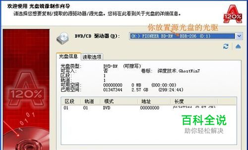 弹出光盘镜像制作向导窗口,“DVD/CD 驱动器”处选择你放置源光盘的光驱,一般会自动检索到。窗口上还有光盘信息和读取选项。