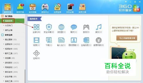 现在很多用户电脑都安装了360软件了吧,安装方法我就不细说了。切入正题 打开电脑360软件,点击软件管家,选择我的软件,选择好分类,如果不知道分类的就选择全部。找到相应的图标,点击卸载,确定就ok了