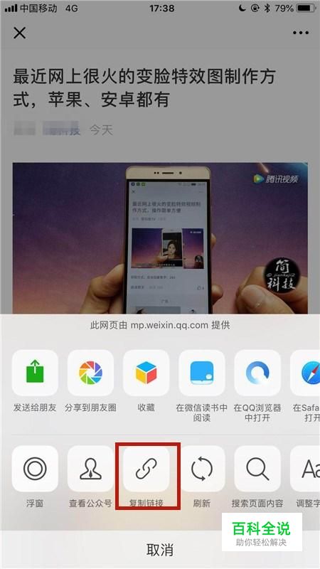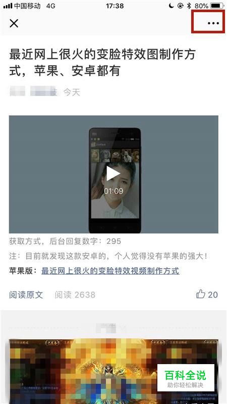 首先点击公众号中一个带有视频的文章,并点击屏幕右上方的三个点,如下图所示。