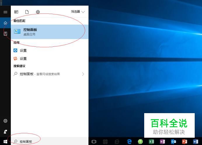如图所示,搜索框输入"控制面板"。Cortana(小娜)显示搜索结果,点击"最佳匹配→控制面板"项。