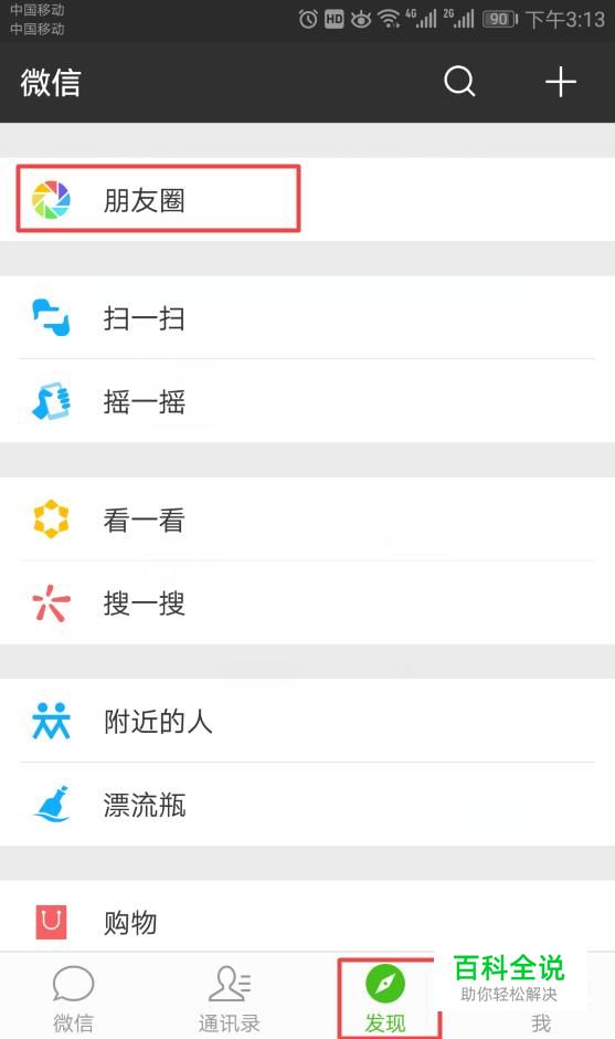 首先,我们打开我们的手机,然后登录进入微信,然后我们点击发现,之后我们点击朋友圈;