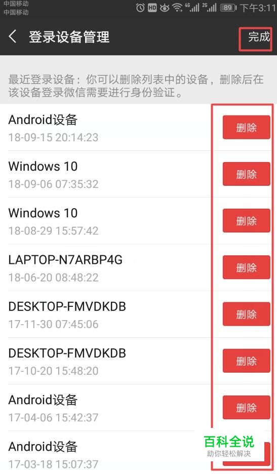 弹出的界面,我们点击删除,之后点击完成,然后我们再用这些设备登录的时候就需要进行验证后才能登录了。