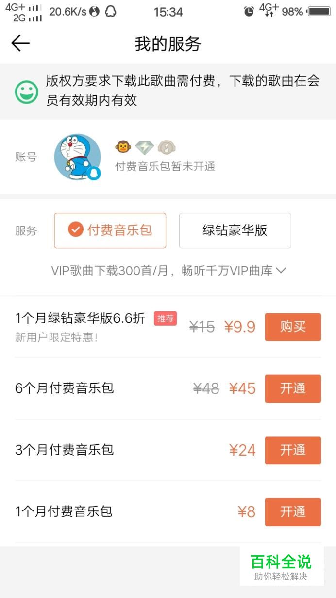 紧接着,我们也可以选择开通绿钻,开通绿钻的话系统会送付费音乐包,但是也只在绿钻有效期内有效。