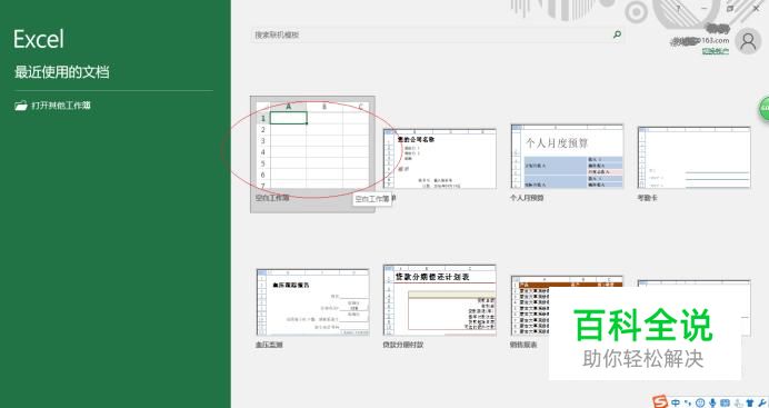 启动Excel 2016电子表格应用程序,如图所示点击屏幕右侧新建空白工作簿。