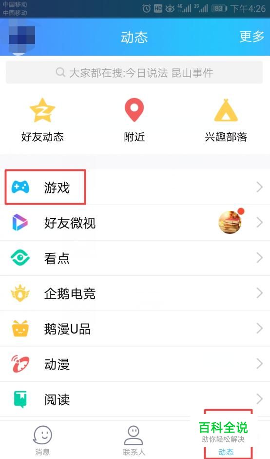 进入QQ后,我们点击右下角的动态,然后我们点击游戏;