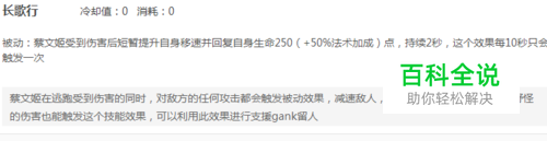 被动:长歌行 冷却值:0消耗:0 被动:蔡文姬受到伤害后短暂提升自身移速并回复自身生命250(+50%法术加成)点,持续2秒,这个效果每10秒只会触发一次 蔡文姬在逃跑受到伤害的同时,对敌方的任何攻击都会触发被动效果,减速敌人,能更好地进行撤退,小兵和野怪的伤害也能触发这个技能效果,可以利用此效果进行支援gank留人 小窍门:没血时,可以让小兵(野怪)打一下触发被动回血